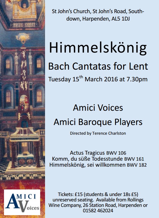 Amici Voices’ exploration of Bach’s sacred repertory in their one-voice-per-part formation continues with a concert of Lenten Cantatas. On Tuesday March 15th 2016, they will perform three cantatas: BWV 106, 161 and 182, which are amongst only a handful of surviving Bach vocal works written or suitable for Lent. Once again, Amici Voices will be joined by Amici Baroque Players, who include some of the finest players in their field. The relatively small number of performers (with one player and singer per part) enables the wonderful detail of the music, especially the counterpoint, and the unusual instrumentation, to be better heard and appreciated. The three cantatas occupy a similar emotional and expressive terrain to the Passion settings, exploring the human response to Christ’s suffering, forgiveness and love.